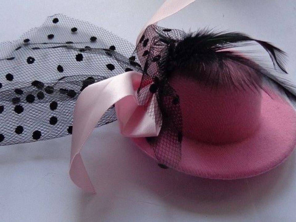 Прикраса для волосся, капелюшок з шпилькою, діаметром приблизно 10 см. прикрашена бантом з вуаллю і пір'ям. Ціна за 1шт.