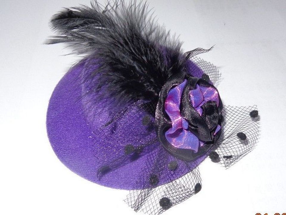 Прикраса для волосся, капелюшок з шпилькою, діаметром приблизно 10 см. Прикрашена квіткою, бантом і пір'ям. Ціна за 1шт.