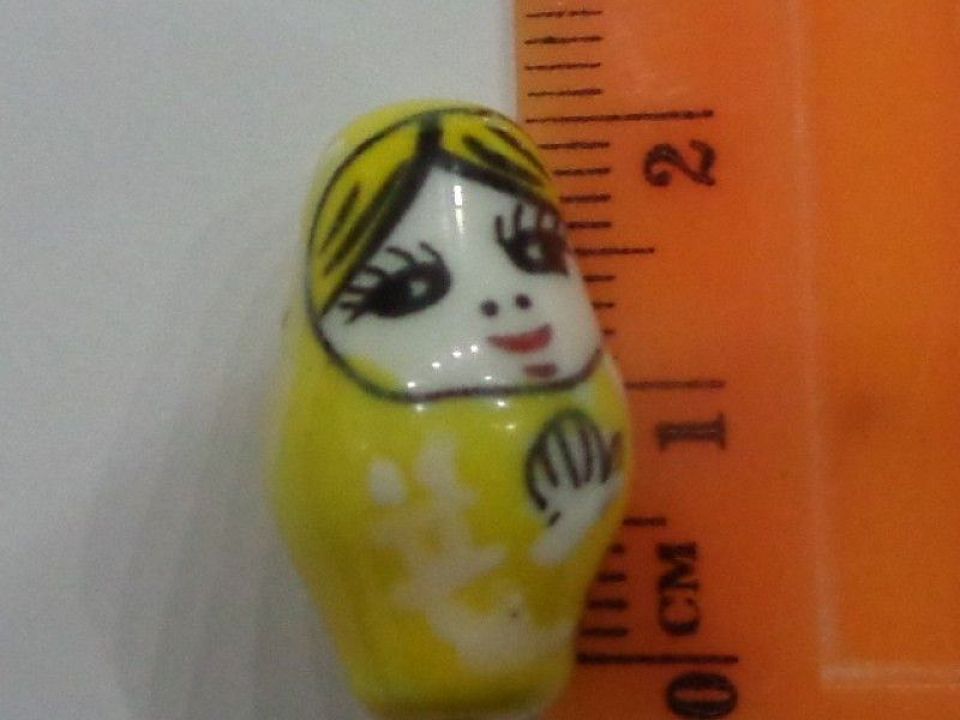 Фарфорова намистинка ручної роботи у вигляді матрьошки з розписом по глазурі. Діаметр отвору: близько 2 мм. Ціна за 1 намистину.
