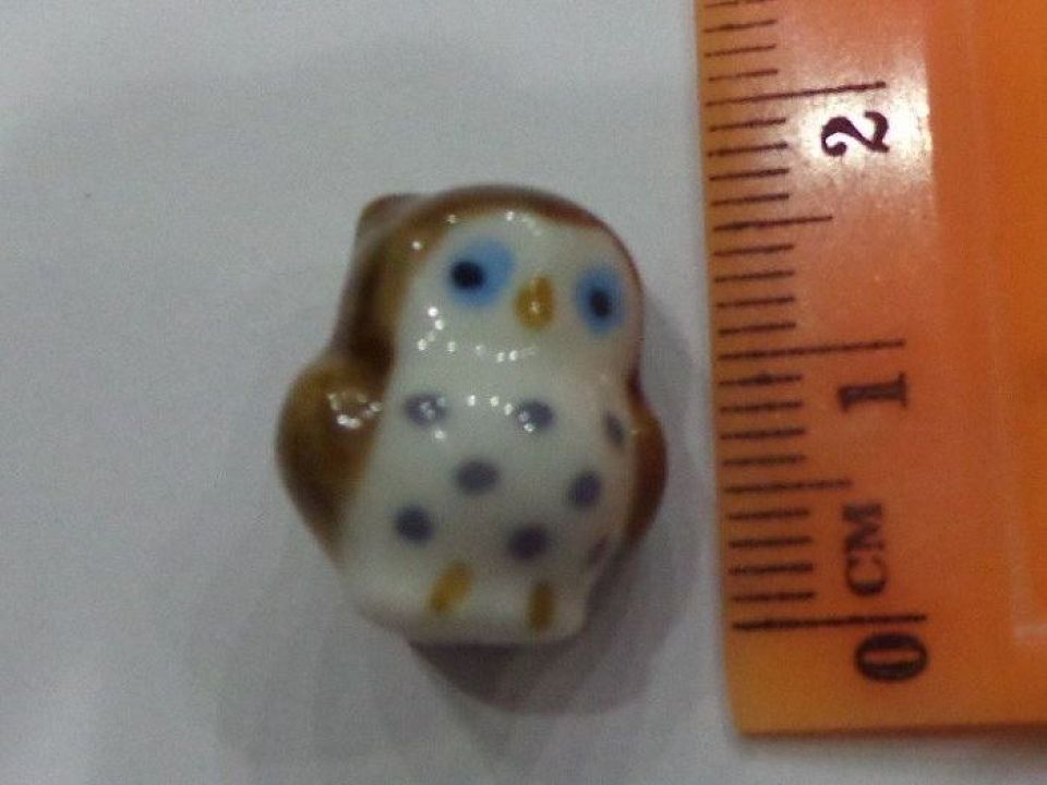Фарфорова намистинка ручної роботи у вигляді сови з розписом по глазурі. Діаметр отвору: близько 2 мм. Ціна за 1 намистину.