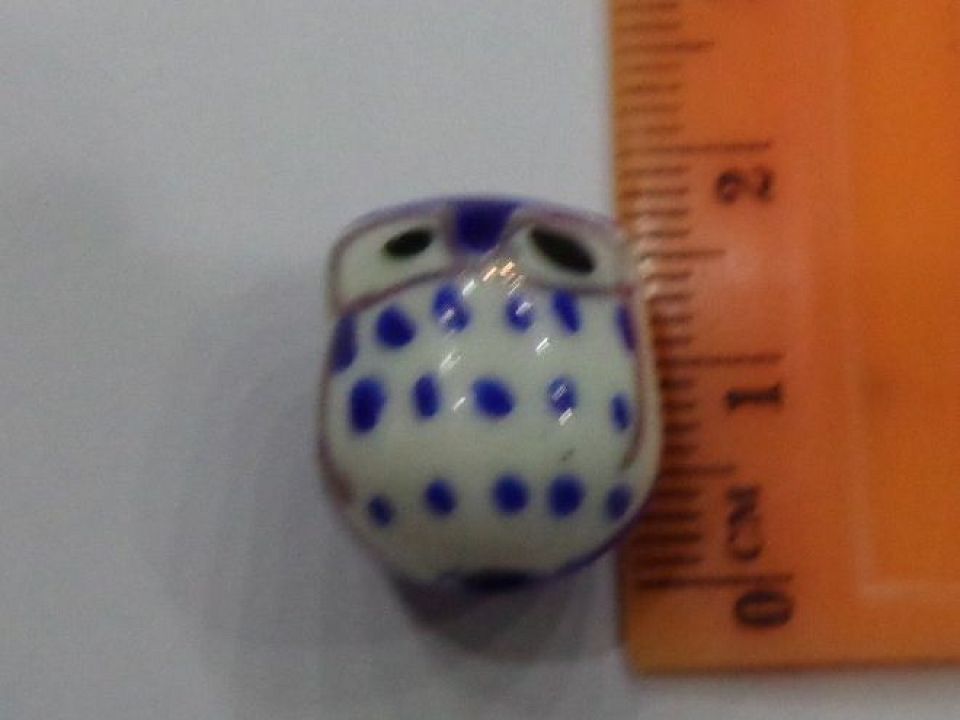 Фарфорова намистинка ручної роботи у вигляді сови з розписом по глазурі. Діаметр отвору: близько 2 мм. Ціна за 1 намистину.
