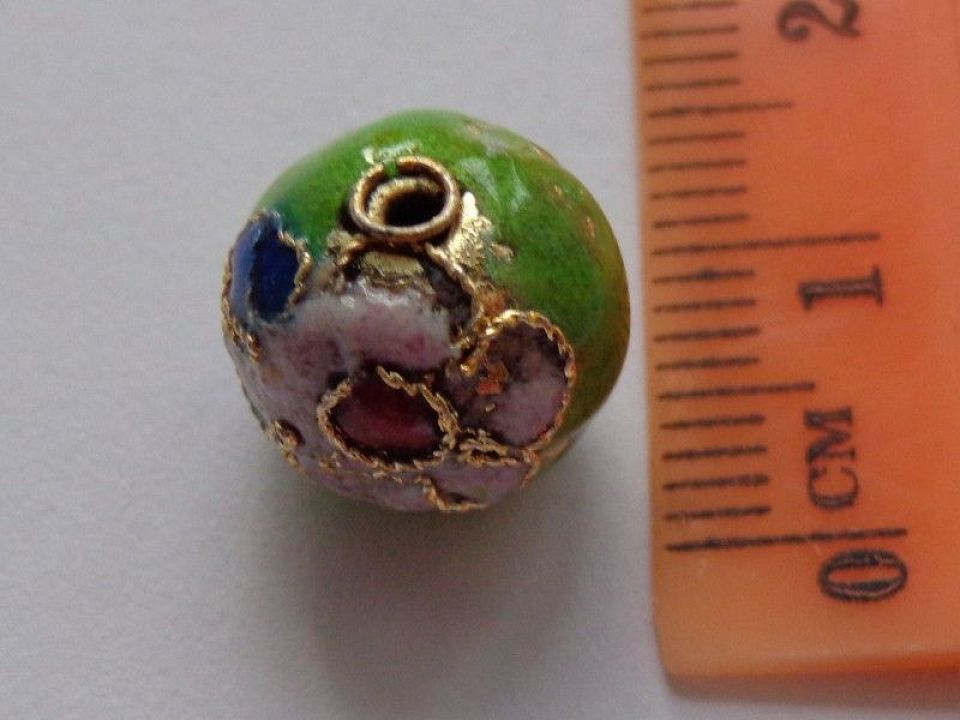 Намистина металева виготовлена в техніці Клуазоне з елементами емалі. Діаметр 12 мм, отвір близько 2 мм. Ціна за 1 шт