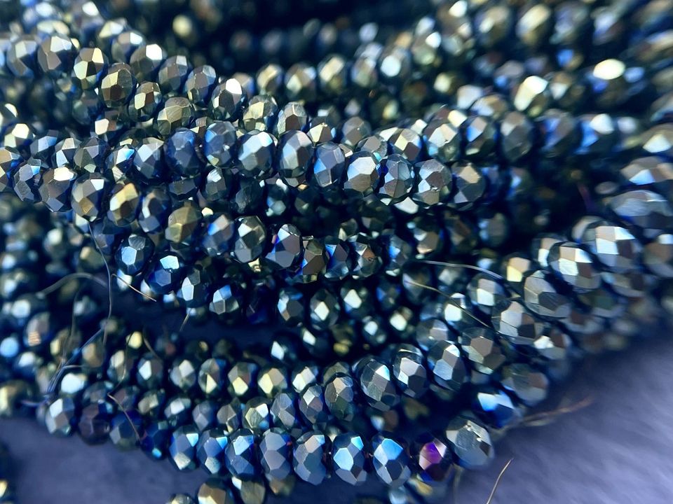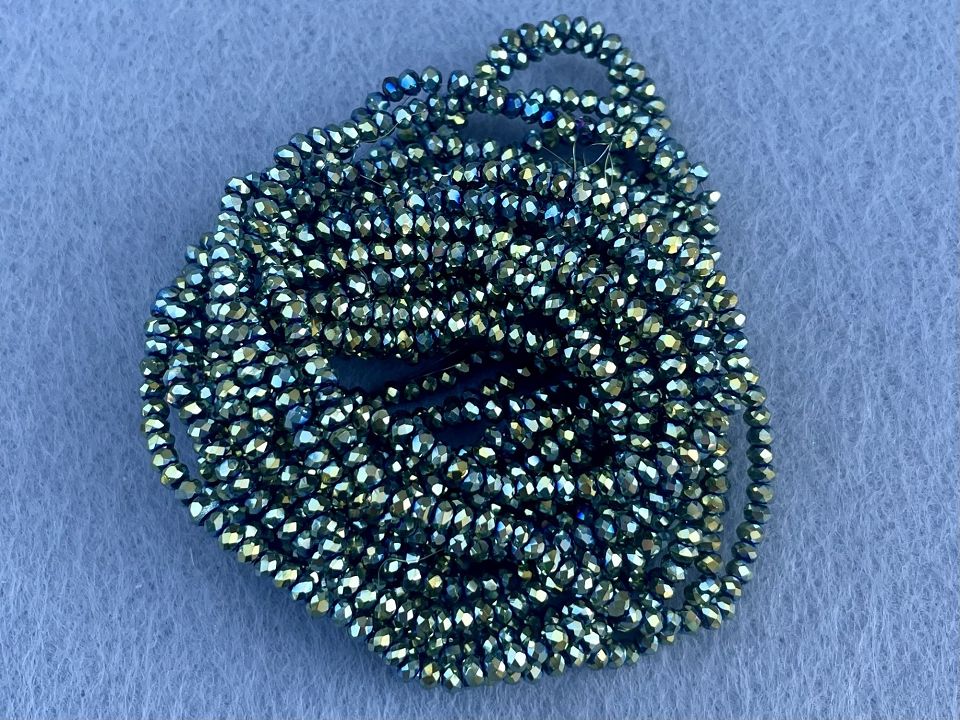 Кришталеві намистини, грановані. Розмір: 2*3мм, отвір: 1 мм. Форма: рондель, сфера. У нитці: 160+-3шт. Ціна за 1 нитку.