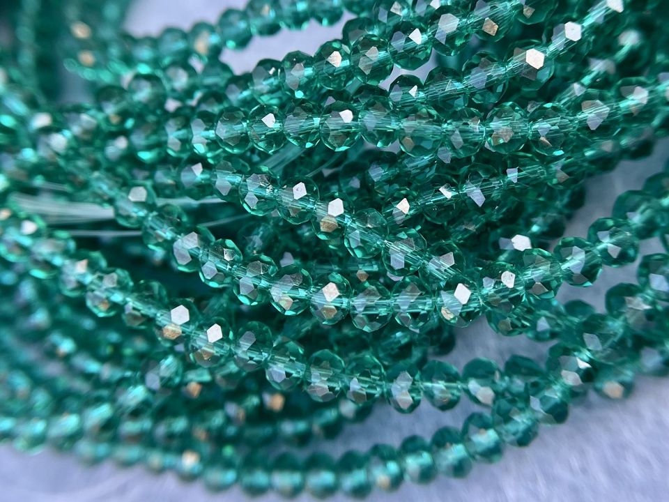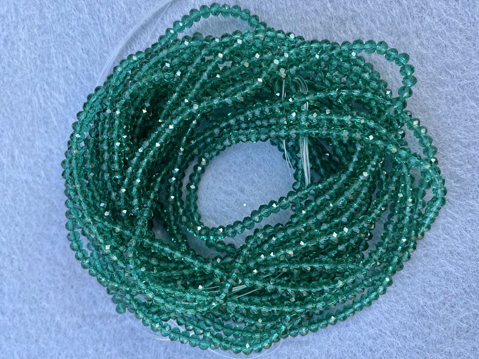Кришталеві намистини, грановані. Розмір: 2*3мм, отвір: 1 мм. Форма: рондель, сфера. У нитці: 160+-3шт. Ціна за 1 нитку. Колір-смарагдовий.
