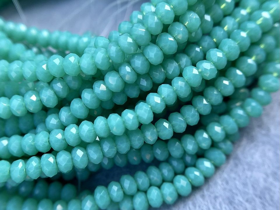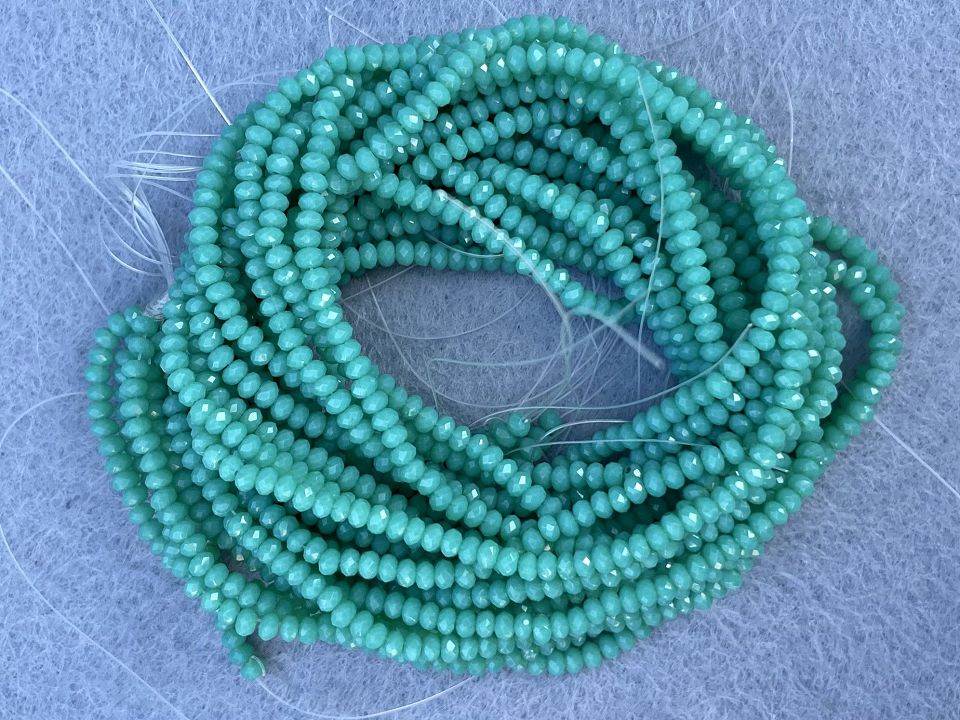 Кришталеві намистини, грановані. Розмір: 2*3мм, отвір: 1 мм. Форма: рондель, сфера. У нитці: 160+-3шт. Ціна за 1 нитку. Колір-бірюзовий-напівпрозорий.