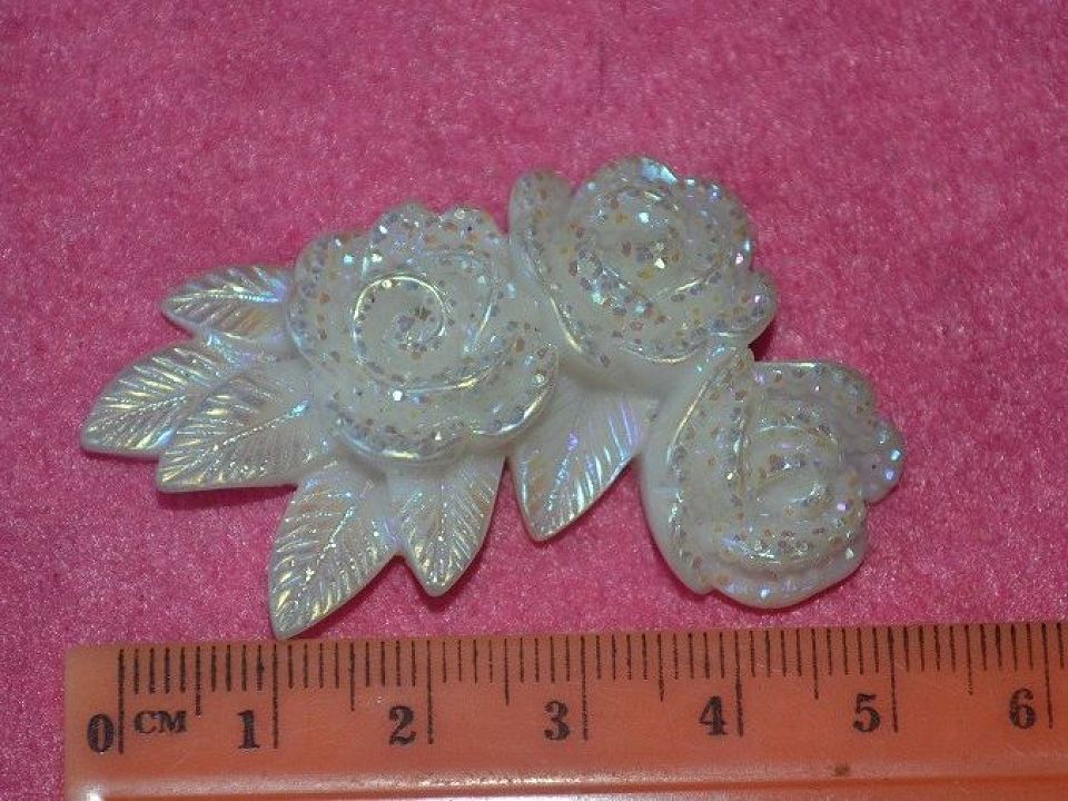 Пластиковий кабошон вигляді квітки, має плоске (рівне) підстава. Розмір троянди 5 см, підстава 3см. Використовується для прикрас бантів, шпильок і інших різних виробів