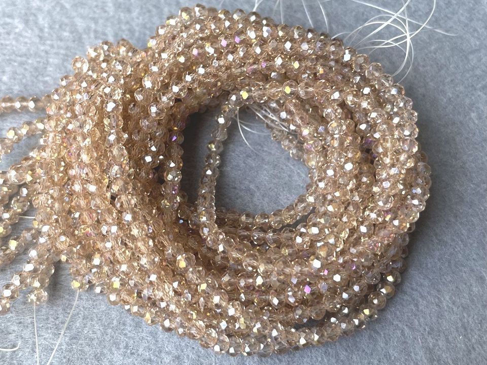 Кришталеві намистини, грановані. Розмір: 3*3,5мм, отвір: 1 мм. Форма: рондель, сфера. У нитці: 120+-5шт. Ціна за 1 нитку. Колір бежевий.