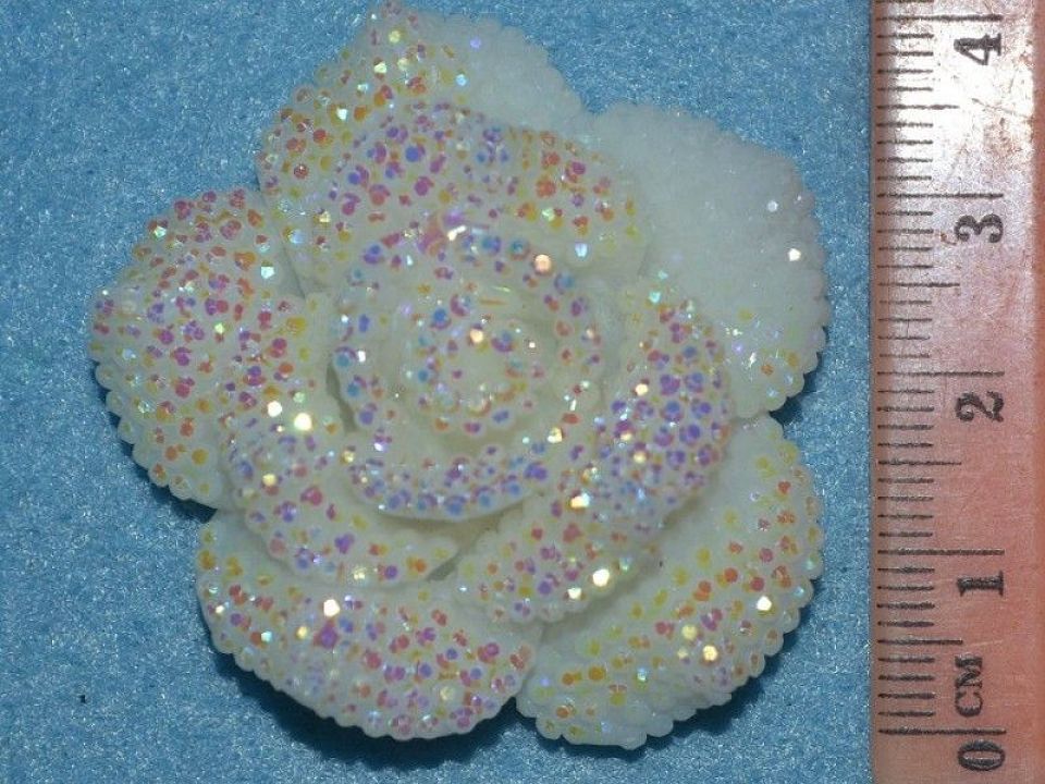 Пластиковий кабошон вигляді троянди, усипаний каменями має плоске (рівне) підстава. Розмір троянди 4см, підстава 2.5см.