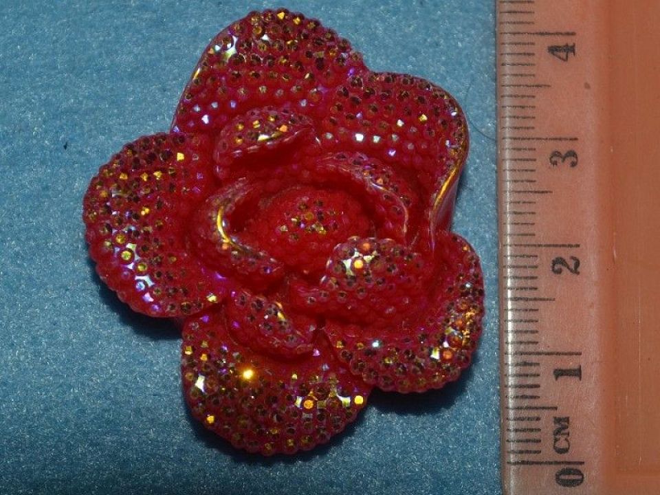 Пластиковий кабошон вигляді троянди, усипаний каменями має плоске (рівне) підстава. Розмір троянди 4см, підстава 2.5см. Використовується для прикрас бантів, шпильок і інших різних виробів