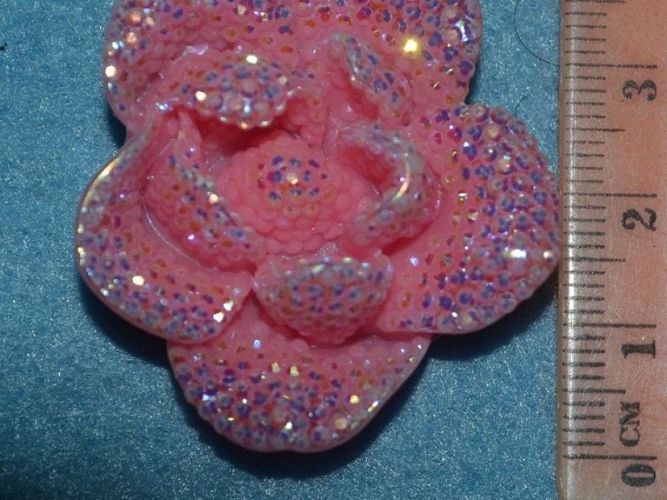 Пластиковий кабошон вигляді троянди, усипаний каменями має плоске (рівне) підстава. Розмір троянди 4см, підстава 2.5см. Використовується для прикрас бантів, шпильок і інших різних виробів