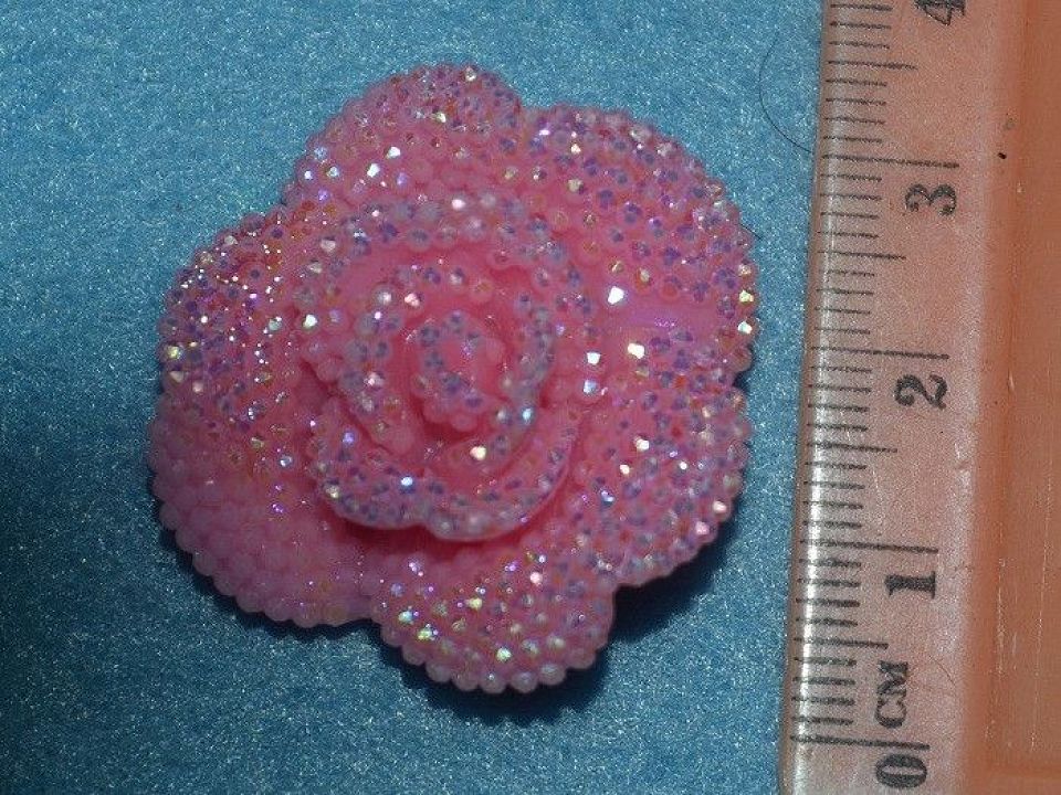 Пластиковий кабошон вигляді троянди, усипаний каменями має плоске (рівне) підстава. Розмір троянди 4см, підстава 2.5см. Використовується для прикрас бантів, шпильок і інших різних виробів