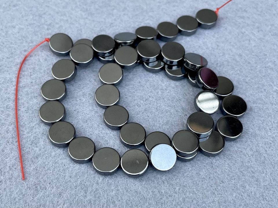 Гематит-натуральний, гладкий. Розмір намистини: 10мм, товщина: 3мм. Кількість намистин на нитці: 40 (+-2шт). Отвір: 1мм. Ціна за нитку (без замку). Довжина нитки: 40 см