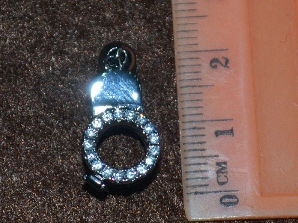 замочек работает по принцыпу прищепка цепляется за кольцо с одной стороны, за колокольчик с другой стороны (антиалергенная сталь без содержания никеля) цвет темная сталь укр
