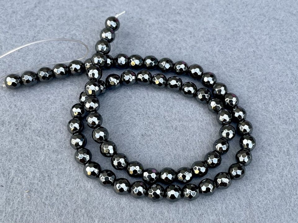 Гематит гранований. Розмір намистини: 6мм, отвір: 1мм. Кількість намистин на нитці: 64 (+-2шт). Ціна за нитку (без замку). Довжина нитки: 40 см
