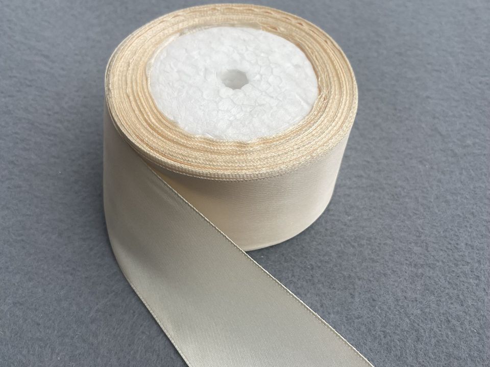 Стрічка атласна-ширина 5 см. У мотку ~23 метри. Колір молочний . Застосовують для прикраси, обробки одягу, вишивання стрічками, плетіння стрічками і т.д. Ціна вказана за 1 моток. Виробництво – Китай.