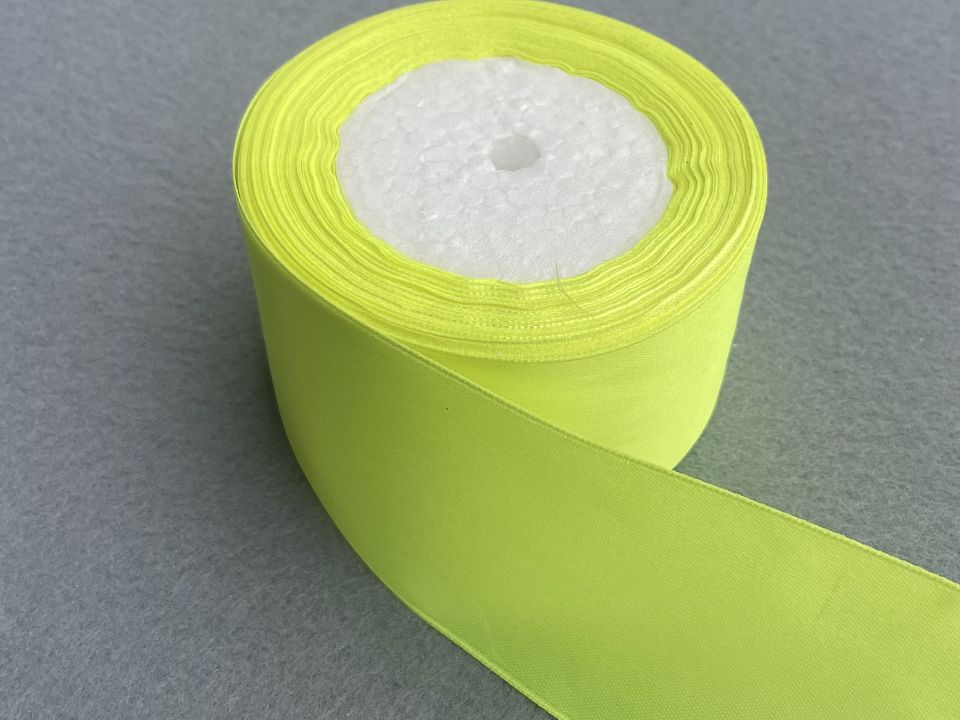 Стрічка атласна-ширина 5 см. У мотку ~23 метри. Колір кислотно-жовтий . Застосовують для прикраси, обробки одягу, вишивання стрічками, плетіння стрічками і т.д. Ціна вказана за 1 моток. Виробництво – Китай.