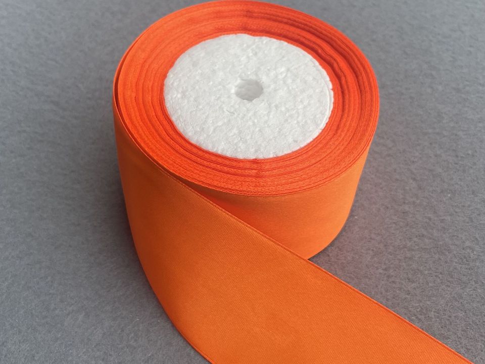 Стрічка атласна-ширина 5 см. У мотку ~23 метри. Колір-кислотно-помаранчевий. Застосовують для прикраси, обробки одягу, вишивання стрічками, плетіння стрічками і т.д. Ціна вказана за 1 моток. Виробництво – Китай.