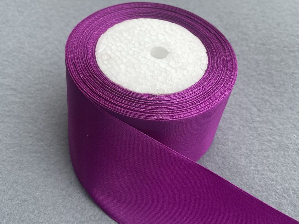 Стрічка атласна-ширина 5 см. У мотку ~23 метри. Колір-яскраво ліловий. Застосовують для прикраси, обробки одягу, вишивання стрічками, плетіння стрічками і т.д. Ціна вказана за 1 моток. Виробництво – Китай.