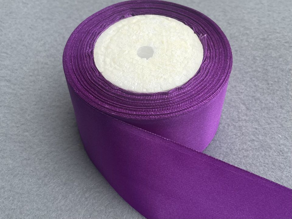 Стрічка атласна-ширина 5 см. У мотку ~23 метри. Колір-фіолетовий. Застосовують для прикраси, обробки одягу, вишивання стрічками, плетіння стрічками і т.д. Ціна вказана за 1 моток. Виробництво – Китай.