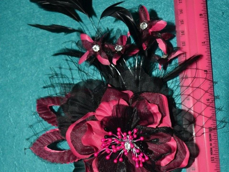 Квітка декоративна 12-14см, з основою 2 в 1-використовується як брошка і шпилька. Прикрашена тичинками, дрібними квіточками і пір'ям. Ціна за 1 шт