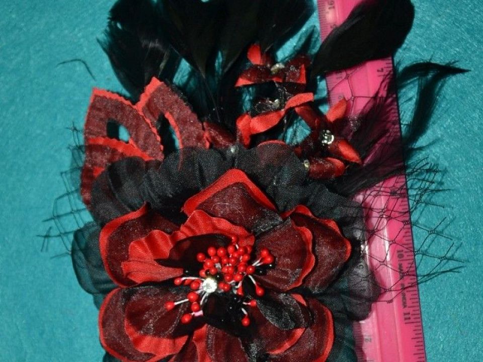 Квітка декоративна 12-14см, з основою 2 в 1-використовується як брошка і шпилька. Прикрашена тичинками, дрібними квіточками і пір'ям. Ціна за 1 шт