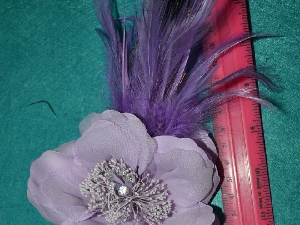 Квітка декоративний 12-14см, з основою 2 в 1-використовується як брошка і шпилька. Прикрашена тичинками зі стразами і пір'ям. Ціна за 1 шт