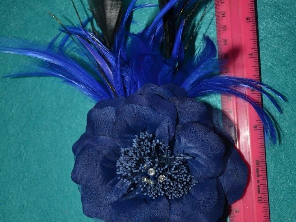 Квітка декоративний 12-14см, з основою 2 в 1-використовується як брошка і шпилька. Прикрашена тичинками зі стразами і пір'ям. Ціна за 1 шт
