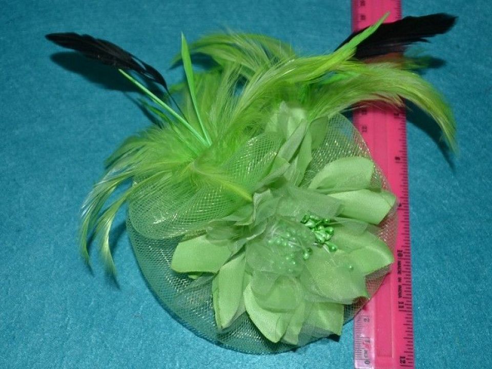 Квітка 2 в 1, з тканини-прикрашений тичинками і стразами, пір'ям і регіліном. Діаметр ~ 10-15см. Може використовуватися як шпилька або як брошку. Ціна за 1 шт