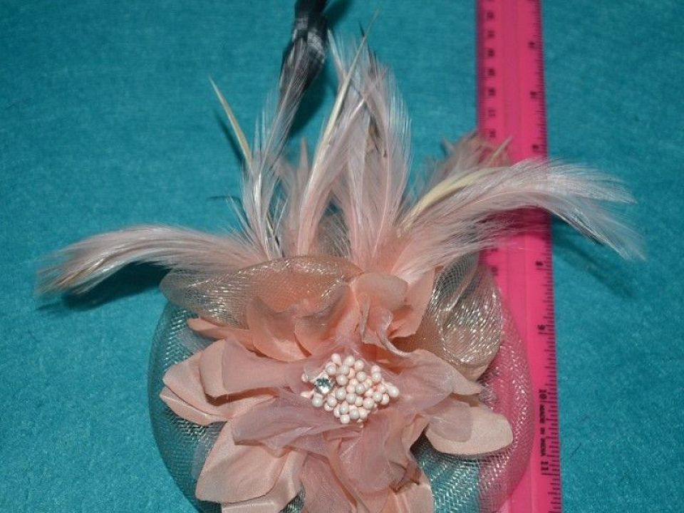 Квітка 2 в 1, з тканини-прикрашений тичинками і стразами, пір'ям і регіліном. Діаметр ~ 10-15см. Може використовуватися як шпилька або як брошку. Ціна за 1 шт