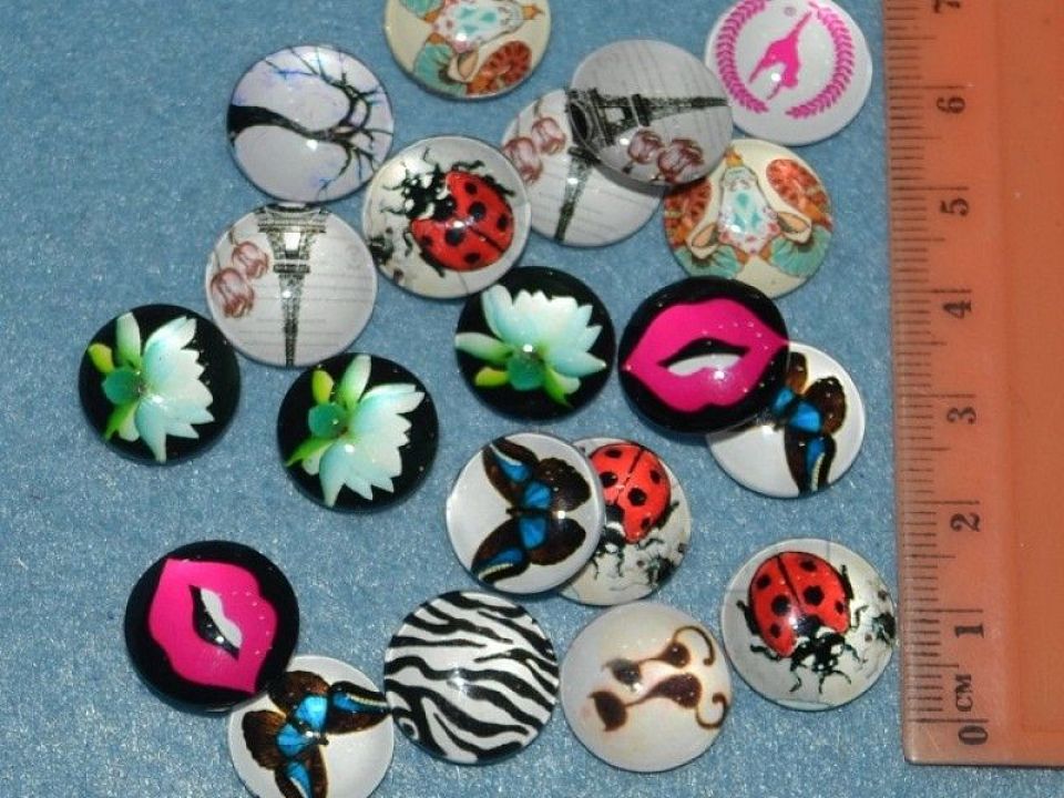 Камея (кабошон) - лінза скляна 15мм з різними зображеннями, упаковка 20 шт. Форма коло з плоским підставою.