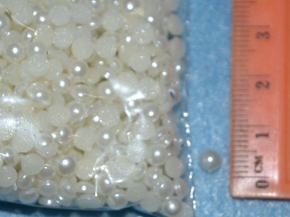 Декоративний акриловий полужемчуг - які є імітацією справжніх перлин, поділених навпіл, має розмір 4 мм, колір кремовий. Упаковка близько 600штук