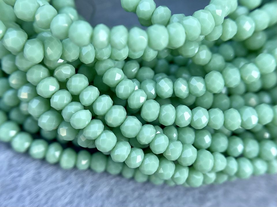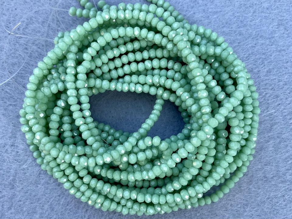 Кришталеві намистини, грановані. Розмір: 2*3мм, отвір: 1 мм. Форма: рондель, сфера. У нитці: 160+-3шт. Ціна за 1 нитку. Колір-світло салатовий.