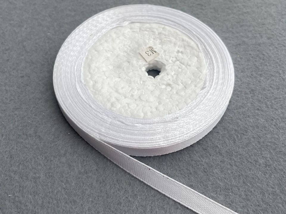 Стрічка атласна-ширина 6мм. У мотку ~23 метри. Колір-білий. Застосовують для прикраси, оздоблення одягу, вишивання стрічками, плетіння стрічками тощо. Ціна вказана за 1 моток. Виробництво – Китай.