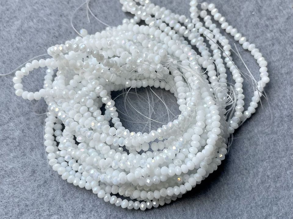 Кришталеві намистини, грановані. Розмір: 1*2мм, отвір: 0,7 мм. Форма: рондель, сфера. У нитці: 160+-3шт. Ціна за 1 нитку.
