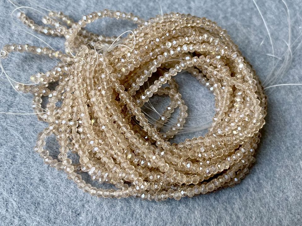 Кришталеві намистини, грановані. Розмір: 1*2мм, отвір: 0,7 мм. Форма: рондель, сфера. У нитці: 160+-3шт. Ціна за 1 нитку.