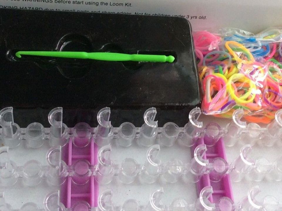Набір гумок для плетіння браслетів. Гумки йдуть в коробці, в наборі з гачком, пластиковими замками і великим верстатом.