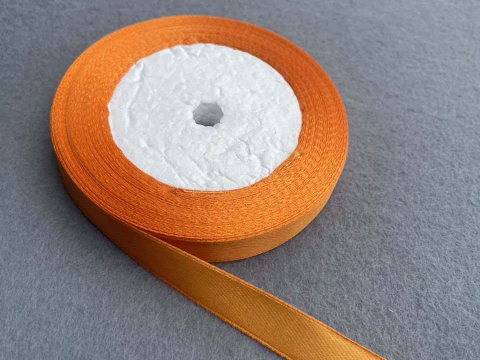Стрічка атласна-ширина 1.2 см. У мотку ~23 метри. Колір-помаранчевий. Застосовують для прикраси, оздоблення одягу, вишивання стрічками, плетіння стрічками тощо. Ціна вказана за 1 моток. Виробництво – Китай.