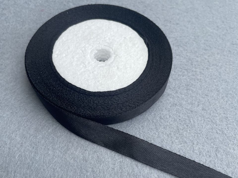 Стрічка атласна-ширина 1.2 см. У мотку ~23 метри. Колір-чорний. Застосовують для прикраси, оздоблення одягу, вишивання стрічками, плетіння стрічками тощо. Ціна вказана за 1 моток. Виробництво – Китай.