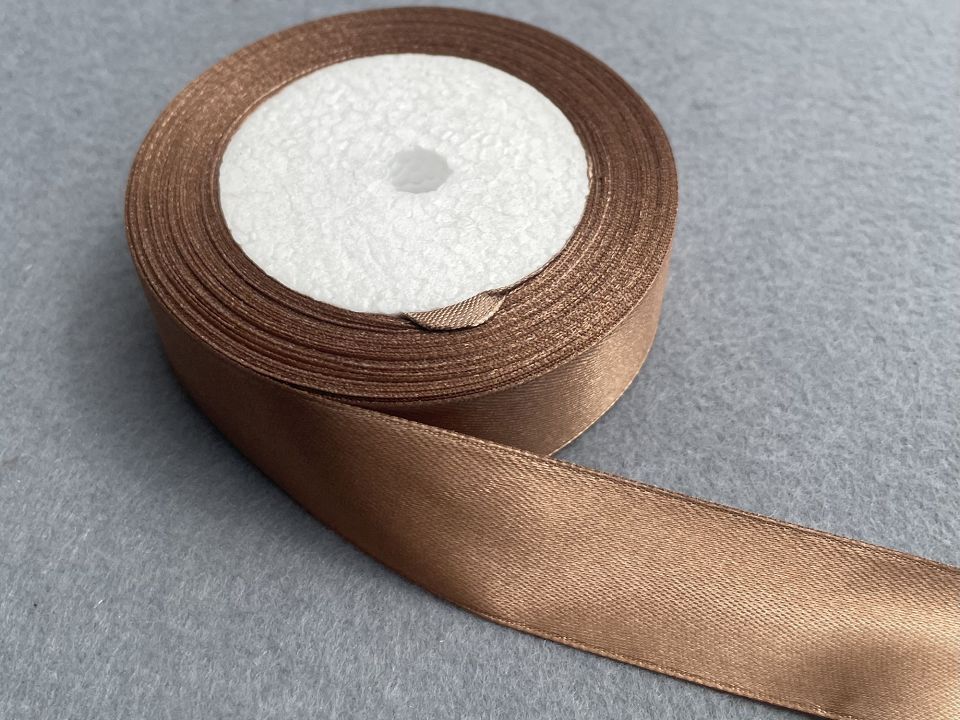 Стрічка атласна-ширина 2.5 см. У мотку ~23 метри. Колір-коричневий. Застосовують для прикраси, оздоблення одягу, вишивання стрічками, плетіння стрічками тощо. Ціна вказана за 1 моток. Виробництво – Китай.
