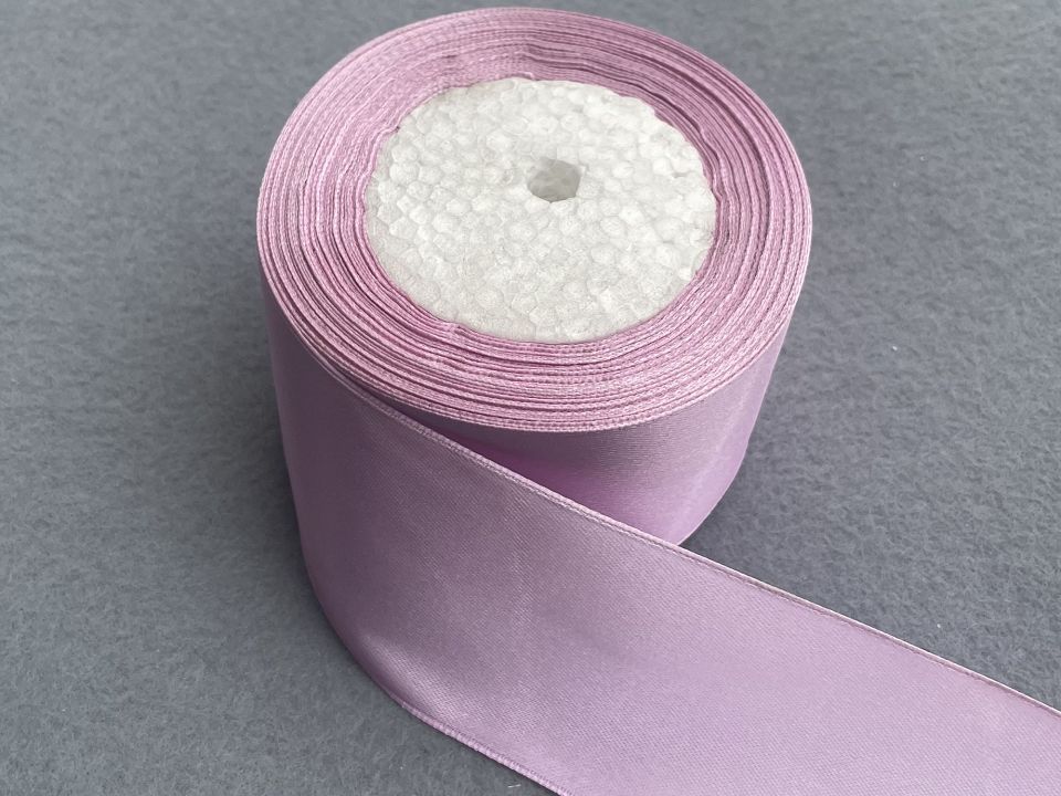 Стрічка атласна-ширина 5 см. У мотку ~23 метри. Колір-світло Ліловий. Застосовують для прикраси, обробки одягу, вишивання стрічками, плетіння стрічками і т.д. Ціна вказана за 1 моток. Виробництво – Китай.