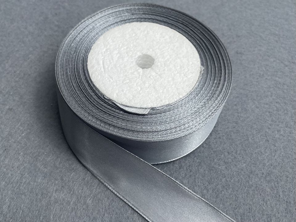 Стрічка атласна-ширина 2.5 см. У мотку ~23 метри. Колір-сірий. Застосовують для прикраси, оздоблення одягу, вишивання стрічками, плетіння стрічками тощо. Ціна вказана за 1 моток. Виробництво – Китай.