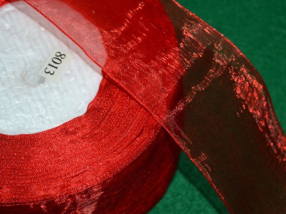 Стрічка з органзи, ширина-5 см. В мотку-46 метрів. Використовуються при будь-яких видах декорування (при виготовленні сувенірів, ляльок, шпильок, гумок, обручів; при упаковці подарунків) .Ленти з органзи вдають із себе тонкі, трохи жорстким і напівпрозорі тканини смужки.