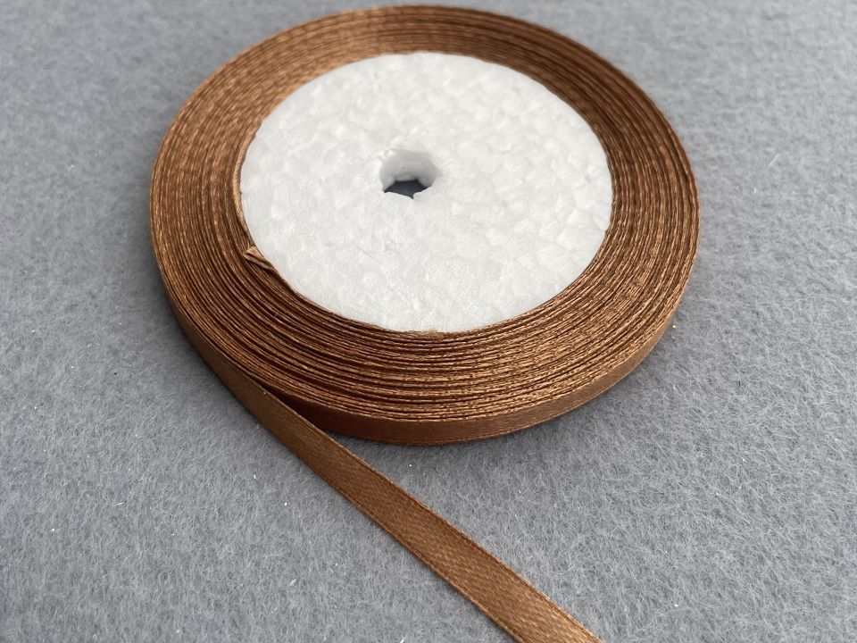 Стрічка атласна-ширина 6мм. У мотку ~23 метри. Колір-коричневий. Застосовують для прикраси, оздоблення одягу, вишивання стрічками, плетіння стрічками тощо. Ціна вказана за 1 моток. Виробництво – Китай.