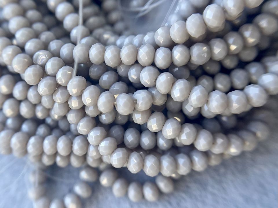 Кришталеві намистини, грановані. Розмір: 3*3,5мм, отвір: 1 мм. Форма: рондель, сфера. У нитці: 145+-5шт. Ціна за 1 нитку. Колір-сіро-бежевий.