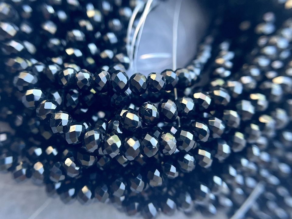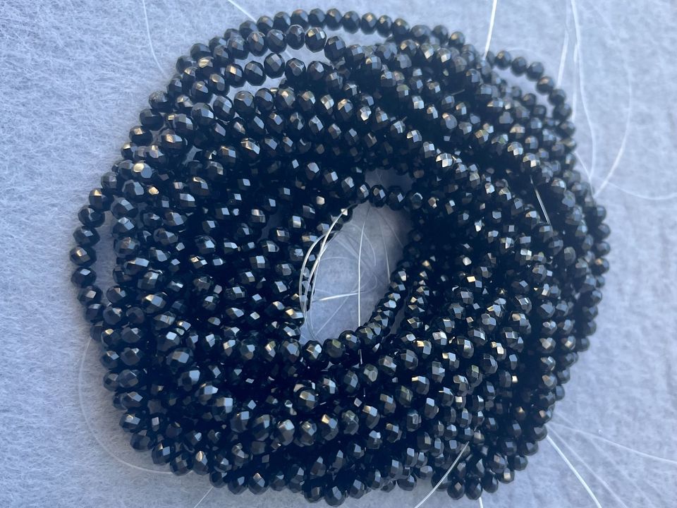 Кришталеві намистини, грановані. Розмір: 3*3,5мм, отвір: 1 мм. Форма: рондель, сфера. У нитці: 145+-5шт. Ціна за 1 нитку. Колір чорний .