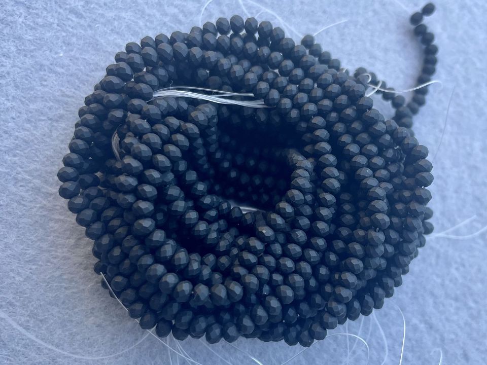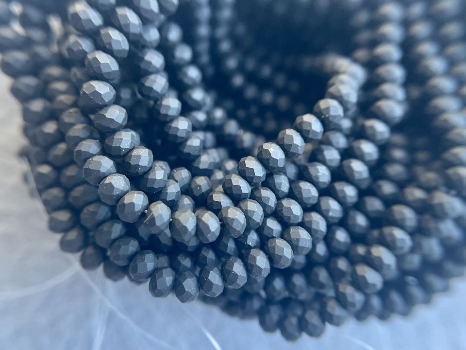 Кришталеві намистини, грановані. Розмір: 3*3,5мм, отвір: 1 мм. Форма: рондель, сфера. У нитці: 145+-5шт. Ціна за 1 нитку. Колір-чорний матовий.