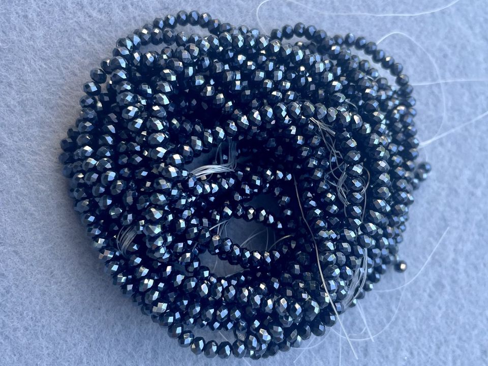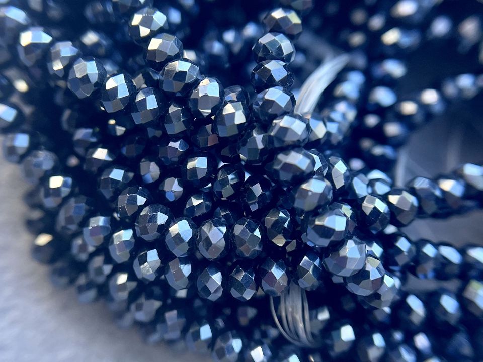 Кришталеві намистини, грановані. Розмір: 3*3,5мм, отвір: 1 мм. Форма: рондель, сфера. У нитці: 145+-5шт. Ціна за 1 нитку. Колір-гематит.
