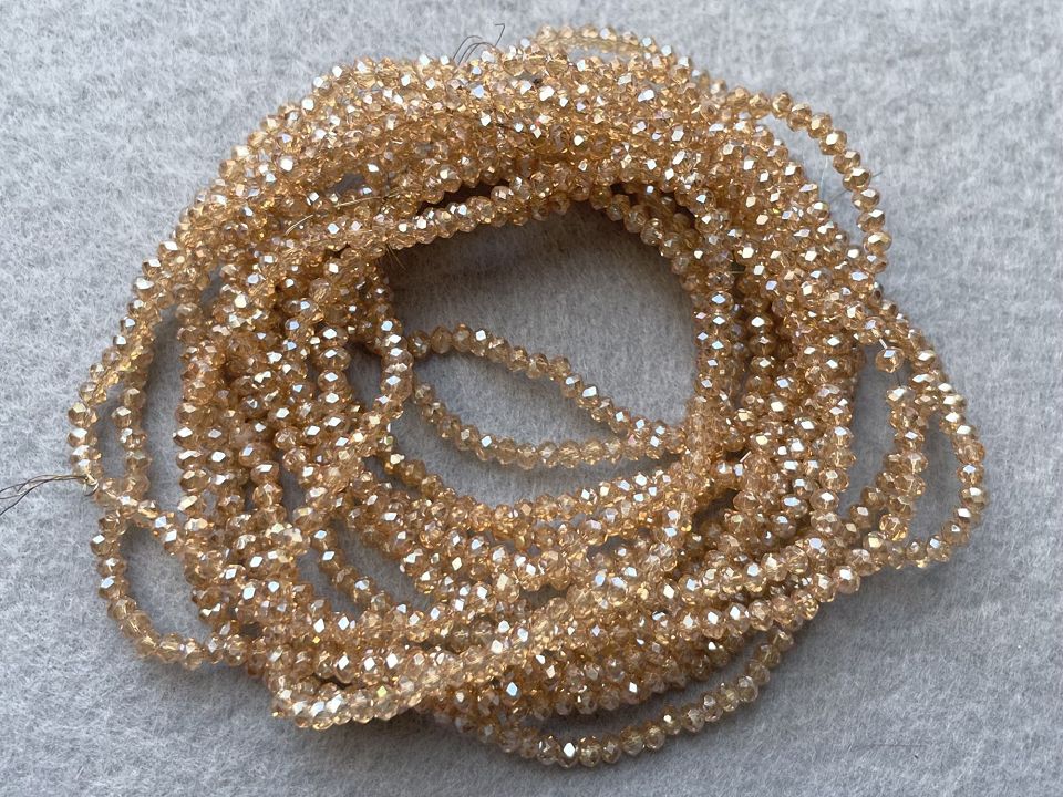 Кришталеві намистини, грановані. Розмір: 2*3мм, отвір: 1 мм. Форма: рондель, сфера. У нитці: 160+-3шт. Ціна за 1 нитку.