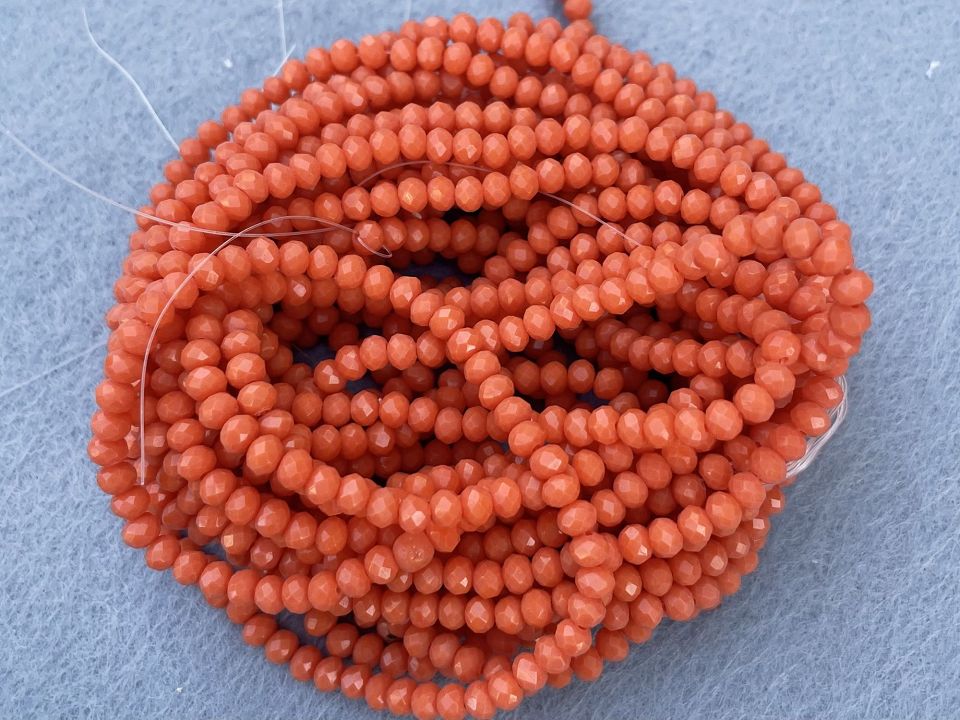 Кришталеві намистини, грановані. Розмір: 4*4,5мм, отвір: 1мм. Форма: рондель, сфера. У нитці: 143+-5шт. Ціна за 1 нитку. Колір помаранчевий.