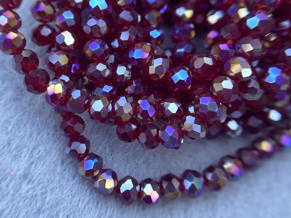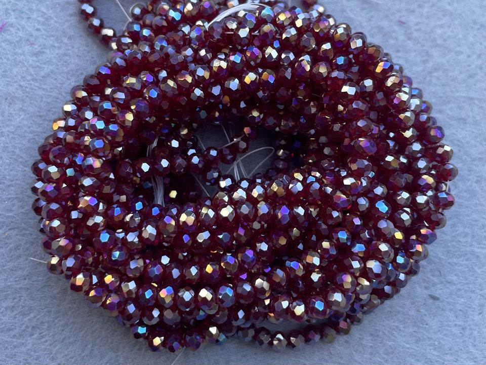 Кришталеві намистини, грановані. Розмір: 4*4,5мм, отвір: 1мм. Форма: рондель, сфера. У нитці: 143+-5шт. Ціна за 1 нитку. Колір-бордовий з переливом.